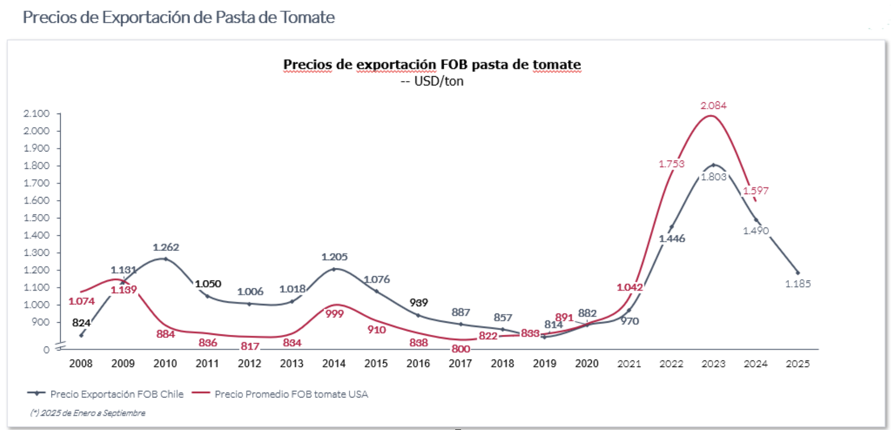 El negocio de Pulpa, Pastas y Jugos generó ingresos ordinarios por USD 89,7 millones al 30 de septiembre de 2025, en comparación con los USD 101,5 millones obtenidos el año anterior, a igual fecha, lo que representa una disminución de 11,6%; esta situación se refleja en una disminución de USD 11,7 millones en EBITDA. Esta baja es explicada por menores precios internacionales en la pasta de tomates.